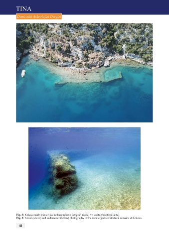 TINA Denizcilik Arkeolojisi Dergisi fig. 3: Kekova sualtı mimari kalıntılarının hava fotoğrafı (üstte) ve sualtı görüntüsü (altta). fig. 3: Aerial (above) and underwater (below) photography of the submerged architectural remains at Kekova. 48